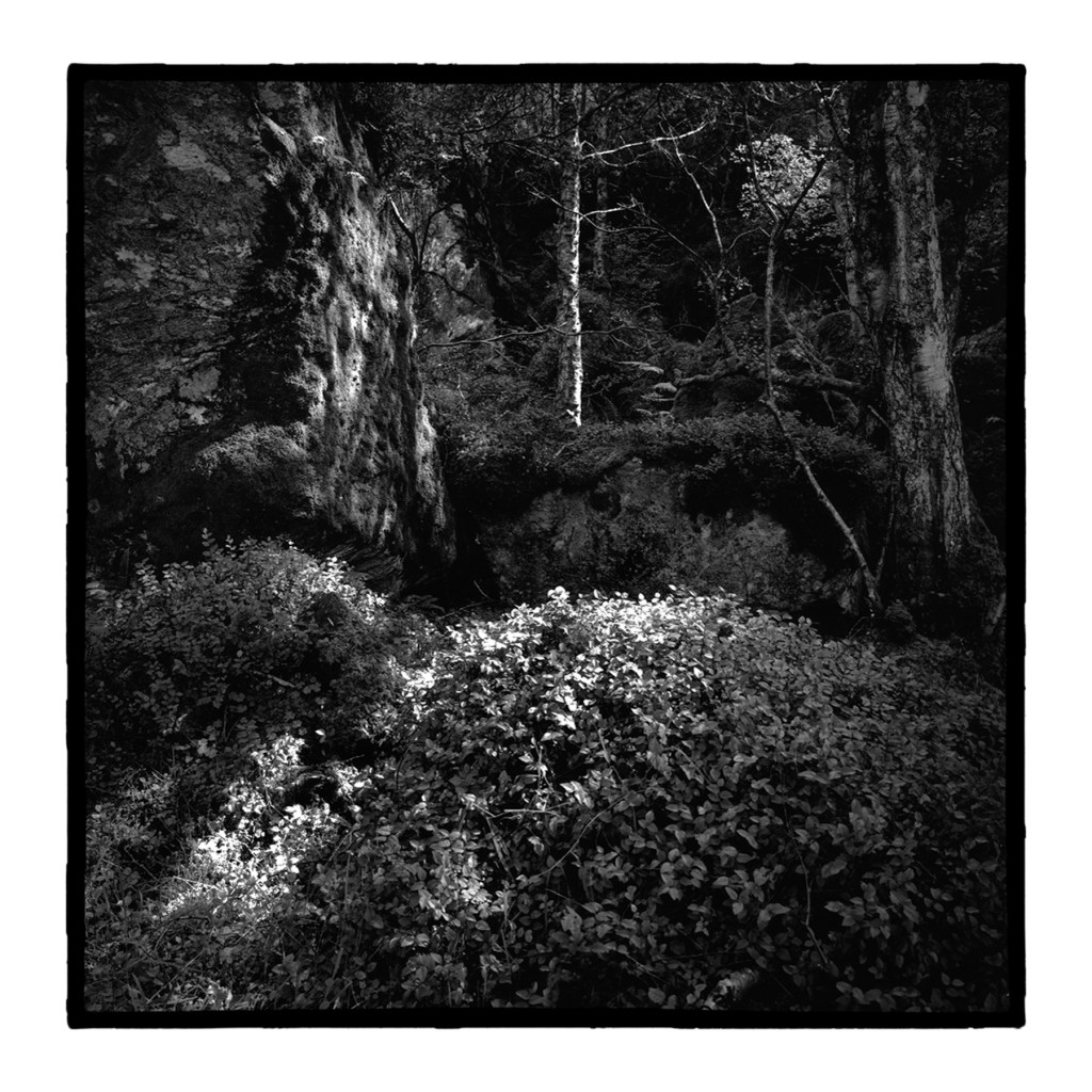 The southern shores of Loch Duntelchaig, in the Monadhliaths near Inverness, are bounded by surprisingly high cliffs. Over millennia, rock fall has created steep boulder strewn slopes and although the cliffs are the preserve of rock climbers, the landscape below is a complex weave of large boulders, bracken, moss, birch and rowan, accessible to the walker. In the shadow of the cliffs, little light penetrates directly and there is a delicate sense of intimacy in the subdued light in the quiet places which can be found nestling amongst the stones.