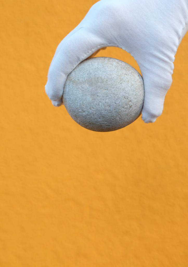 In this sequence of photographs, the gloved hand grasping the stone acts as a metaphor for the way we choose and select what should be given value and status in society. The gloved hand may also connote the hand of a Magician where, by sleight of hand and misdirection, the Magician diverts attention from one thing whilst manipulating another.